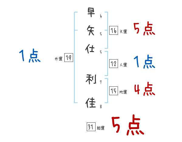 外運![]() | 早矢仕利佳さんの外運は19画の1つ星!優れた才能を持ちますが、協調性が足りないことも。周りの人と協力する事を意識しましょう。 生活面を象徴する運勢です。外部から受ける影響力を表し、結婚運、家庭運や職場、環境への順応性を表します。 |