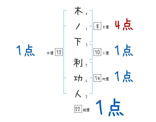 天運![]() | 木ノ下利功人さんの天運は8画の4つ星!勤勉家。根気強く努力し成功する。忍耐力がある。 家系が持つ宿命的な運勢を表します。祖先から受け継いだ苗字ですので自分の力が及びません。家柄を象徴します。 |