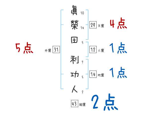 天運![]() | 眞榮田利功人さんの天運は29画の4つ星!完全主義で才能がある。厳格な心の持ち主。 家系が持つ宿命的な運勢を表します。祖先から受け継いだ苗字ですので自分の力が及びません。家柄を象徴します。 |
