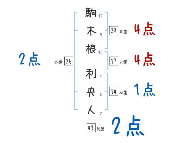 総運![]() | 駒木根利央人さんの総運は43画の2つ星!頑固な性格で独立心が強いかも。やや非現実的で浪費に注意しましょう。 あなたの人生を表す1番重要な運勢です。生涯を通じて影響する総合運となり、主に50歳以降の晩年期に影響を及ぼします。 |