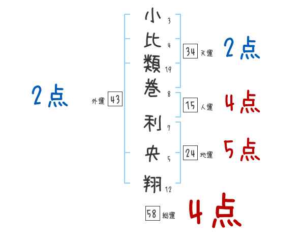 外運![]() | 小比類巻利央翔さんの外運は43画の2つ星!頑固な性格で独立心が強いかも。やや非現実的で浪費に注意しましょう。 生活面を象徴する運勢です。外部から受ける影響力を表し、結婚運、家庭運や職場、環境への順応性を表します。 |