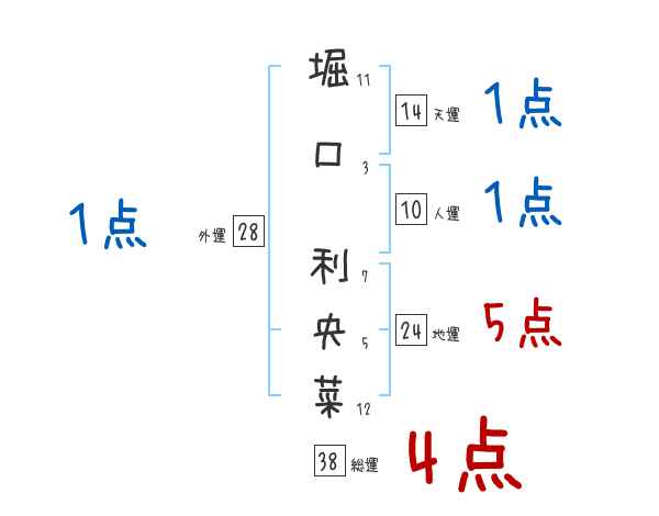 外運![]() | 堀口利央菜さんの外運は28画の1つ星!家庭環境に注意。スポーツで活躍できる能力があるかも。 生活面を象徴する運勢です。外部から受ける影響力を表し、結婚運、家庭運や職場、環境への順応性を表します。 |