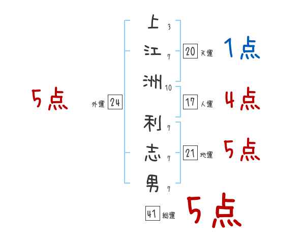 外運![]() | 上江洲利志男さんの外運は24画の5つ星!家庭運が良く順調な人生。金運にも恵まれる。 生活面を象徴する運勢です。外部から受ける影響力を表し、結婚運、家庭運や職場、環境への順応性を表します。 |