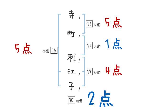 外運![]() | 寺町利江子さんの外運は16画の5つ星!人望が厚く大きく発展する。逆転成功が見える。 生活面を象徴する運勢です。外部から受ける影響力を表し、結婚運、家庭運や職場、環境への順応性を表します。 |