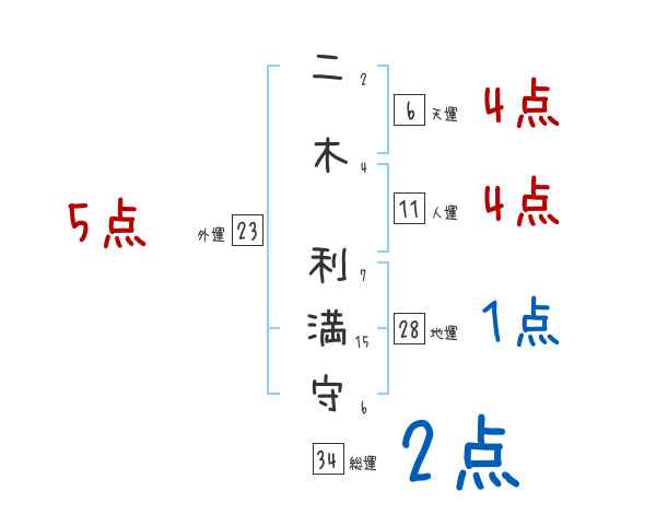 総運![]() | 二木利満守さんの総運は34画の2つ星!独創性に優れるが、自尊心が強く災難に注意しましょう。 あなたの人生を表す1番重要な運勢です。生涯を通じて影響する総合運となり、主に50歳以降の晩年期に影響を及ぼします。 |