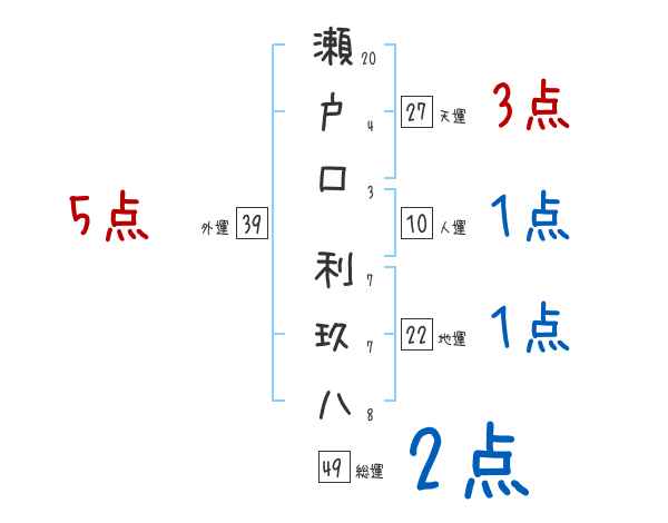 外運![]() | 瀬戸口利玖八さんの外運は39画の5つ星!社交性に優れ人望が厚い。人の上に立ち成功する。 生活面を象徴する運勢です。外部から受ける影響力を表し、結婚運、家庭運や職場、環境への順応性を表します。 |