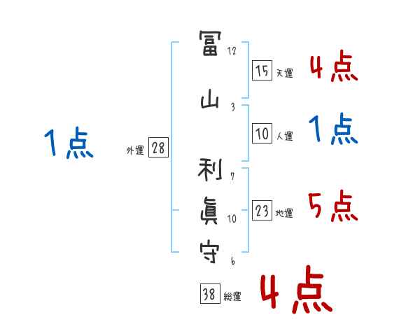| 総運  | 冨山利眞守さんの総運は38画の4つ星!温厚な性格で技術的な才能を発揮する。職人的な仕事に向いている。あなたの人生を表す1番重要な運勢です。生涯を通じて影響する総合運となり、主に50歳以降の晩年期に影響を及ぼします。 |
