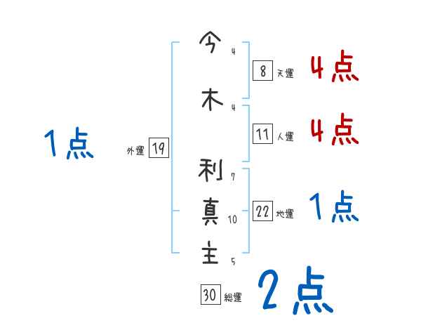 天運![]() | 今木利真主さんの天運は8画の4つ星!勤勉家。根気強く努力し成功する。忍耐力がある。 家系が持つ宿命的な運勢を表します。祖先から受け継いだ苗字ですので自分の力が及びません。家柄を象徴します。 |