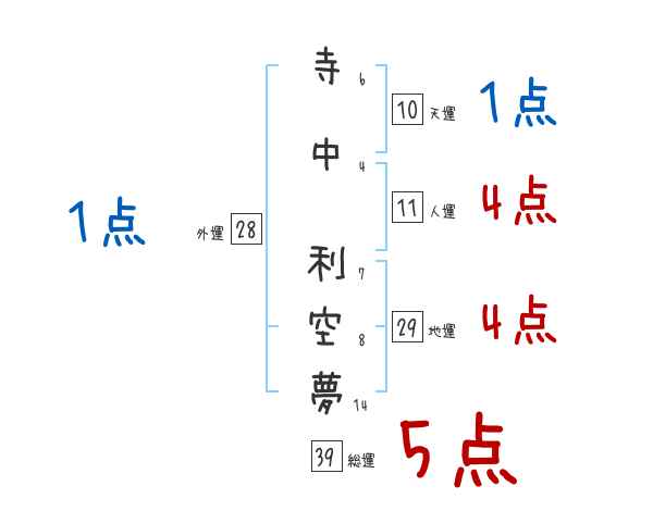天運![]() | 寺中利空夢さんの天運は10画の1つ星!不安を感じやすい傾向。ストレスを抱えないように注意しましょう。 家系が持つ宿命的な運勢を表します。祖先から受け継いだ苗字ですので自分の力が及びません。家柄を象徴します。 |