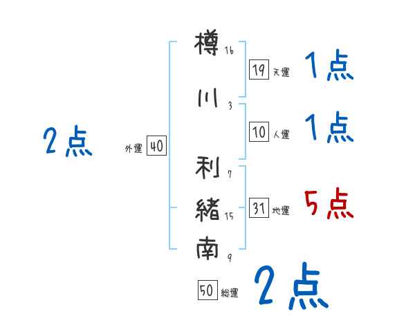 地運![]() | 樽川利緒南さんの地運は31画の5つ星!社交性があり判断力に優れる。順風満帆な人生で円満な生活。 個性を表す基礎的な運勢です。性格形成や対人関係、行動力など家庭環境に影響されます。主に誕生してから20歳くらいまでの若年期の運勢を表します。 |