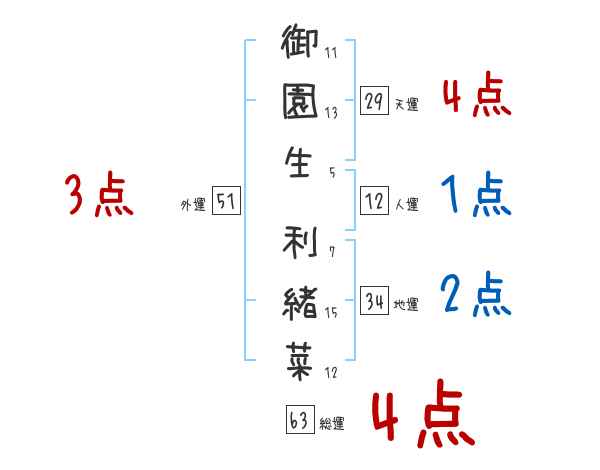 総運![]() | 御園生利緒菜さんの総運は63画の4つ星!家庭運がよく順調な生活。温和な性格。 あなたの人生を表す1番重要な運勢です。生涯を通じて影響する総合運となり、主に50歳以降の晩年期に影響を及ぼします。 |