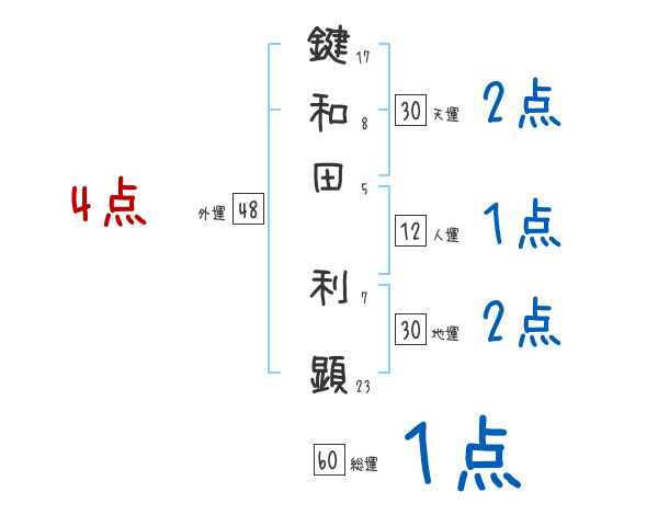 天運![]() | 鍵和田利顕さんの天運は30画の2つ星!浮き沈みの激しさに注意しましょう。 家系が持つ宿命的な運勢を表します。祖先から受け継いだ苗字ですので自分の力が及びません。家柄を象徴します。 |