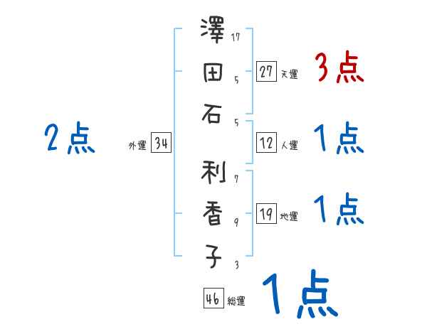 外運![]() | 澤田石利香子さんの外運は34画の2つ星!独創性に優れるが、自尊心が強く災難に注意しましょう。 生活面を象徴する運勢です。外部から受ける影響力を表し、結婚運、家庭運や職場、環境への順応性を表します。 |