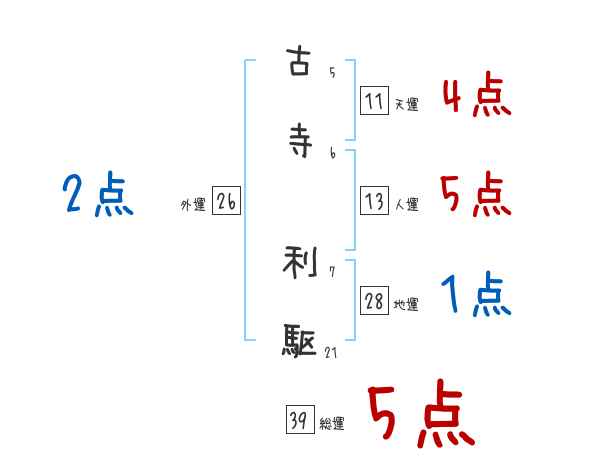 天運![]() | 古寺利駆さんの天運は11画の4つ星!着実に富や地位を得る幸運な人生。 家系が持つ宿命的な運勢を表します。祖先から受け継いだ苗字ですので自分の力が及びません。家柄を象徴します。 |