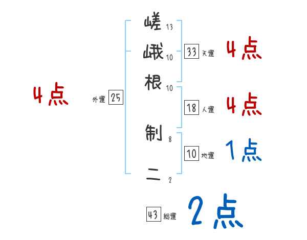 天運![]() | 嵯峨根制二さんの天運は33画の4つ星!権力志向でプライドが高い。勇気があり運を切り開き成功する。 家系が持つ宿命的な運勢を表します。祖先から受け継いだ苗字ですので自分の力が及びません。家柄を象徴します。 |