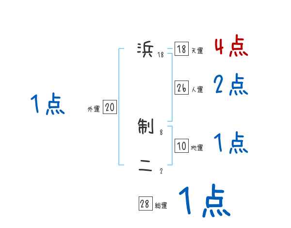 天運![]() | 浜制二さんの天運は18画の4つ星!情熱的で剛気。忍耐力があり信頼される。 家系が持つ宿命的な運勢を表します。祖先から受け継いだ苗字ですので自分の力が及びません。家柄を象徴します。 |