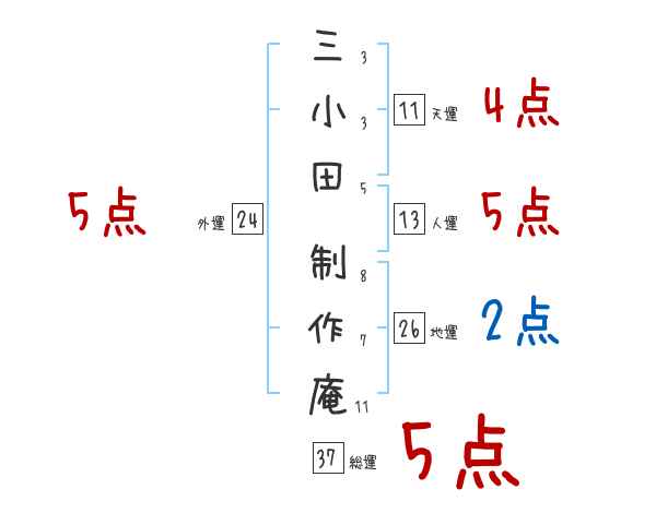 人運![]() | 三小田制作庵さんの人運は13画の5つ星!才能に恵まれ人気がある。名声を手に入れる。円満な人生。 性格や才能などを表す2番目に重要な運勢です。人間関係や協調性、社会的な成功に影響します。主に20歳から50歳ぐらいまでの中年期の運勢を表します。 |