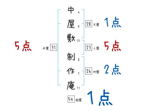 人運![]() | 中屋敷制作庵さんの人運は23画の5つ星!想像力に優れ活力がある。一代で成功し名誉を手に入れる。 性格や才能などを表す2番目に重要な運勢です。人間関係や協調性、社会的な成功に影響します。主に20歳から50歳ぐらいまでの中年期の運勢を表します。 |