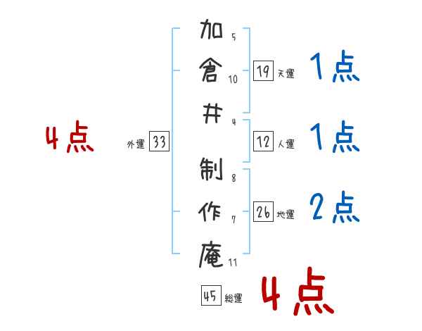天運![]() | 加倉井制作庵さんの天運は19画の1つ星!優れた才能を持ちますが、協調性が足りないことも。周りの人と協力する事を意識しましょう。 家系が持つ宿命的な運勢を表します。祖先から受け継いだ苗字ですので自分の力が及びません。家柄を象徴します。 |