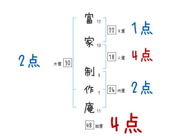 天運![]() | 富家制作庵さんの天運は22画の1つ星!努力することが苦手ないっぽう手先が器用。芸術性にも優れる。 家系が持つ宿命的な運勢を表します。祖先から受け継いだ苗字ですので自分の力が及びません。家柄を象徴します。 |