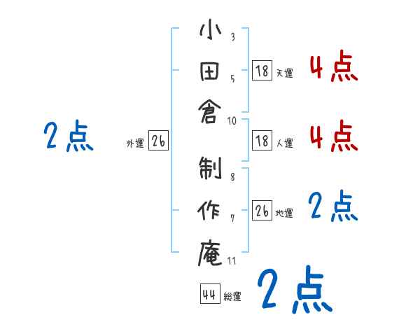 天運![]() | 小田倉制作庵さんの天運は18画の4つ星!情熱的で剛気。忍耐力があり信頼される。 家系が持つ宿命的な運勢を表します。祖先から受け継いだ苗字ですので自分の力が及びません。家柄を象徴します。 |