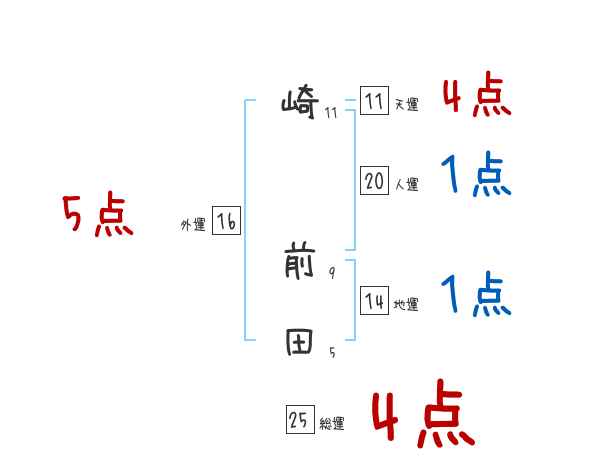 天運![]() | 崎前田さんの天運は11画の4つ星!着実に富や地位を得る幸運な人生。 家系が持つ宿命的な運勢を表します。祖先から受け継いだ苗字ですので自分の力が及びません。家柄を象徴します。 |