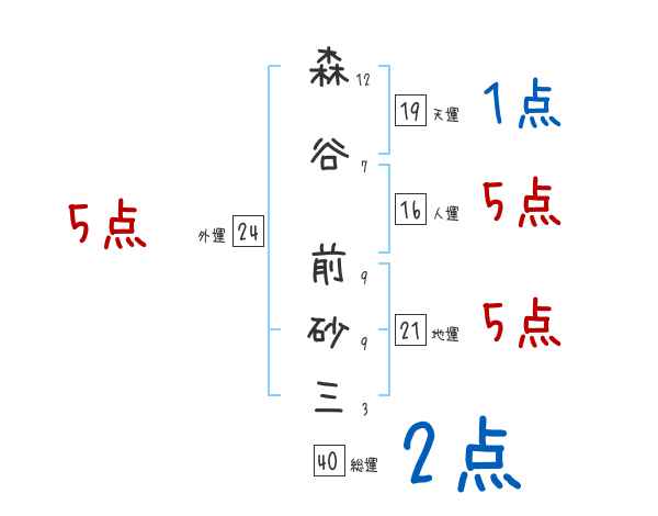 人運![]() | 森谷前砂三さんの人運は16画の5つ星!人望が厚く大きく発展する。逆転成功が見える。 性格や才能などを表す2番目に重要な運勢です。人間関係や協調性、社会的な成功に影響します。主に20歳から50歳ぐらいまでの中年期の運勢を表します。 |