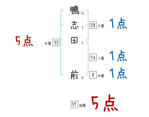 外運![]() | 鴨志田前さんの外運は32画の5つ星!柔軟性があり成功する。チャンスが多く金運が良い。 生活面を象徴する運勢です。外部から受ける影響力を表し、結婚運、家庭運や職場、環境への順応性を表します。 |