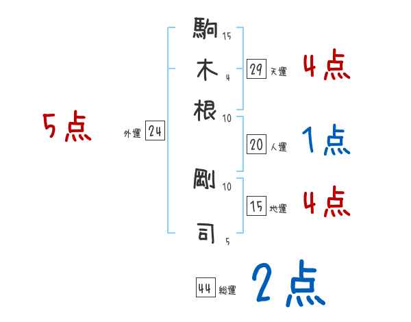 天運![]() | 駒木根剛司さんの天運は29画の4つ星!完全主義で才能がある。厳格な心の持ち主。 家系が持つ宿命的な運勢を表します。祖先から受け継いだ苗字ですので自分の力が及びません。家柄を象徴します。 |