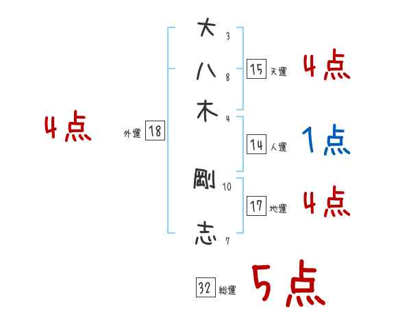 外運![]() | 大八木剛志さんの外運は18画の4つ星!情熱的で剛気。忍耐力があり信頼される。 生活面を象徴する運勢です。外部から受ける影響力を表し、結婚運、家庭運や職場、環境への順応性を表します。 |