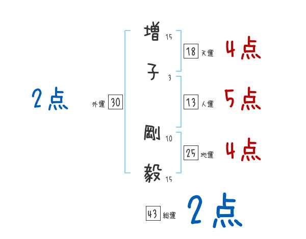 天運![]() | 増子剛毅さんの天運は18画の4つ星!情熱的で剛気。忍耐力があり信頼される。 家系が持つ宿命的な運勢を表します。祖先から受け継いだ苗字ですので自分の力が及びません。家柄を象徴します。 |