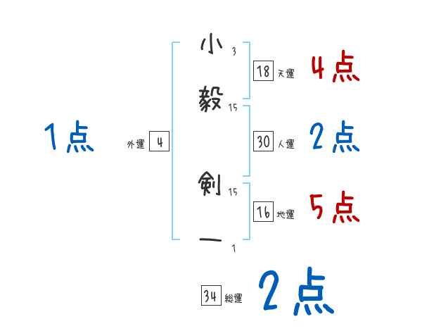 総運![]() | 小毅剣一さんの総運は34画の2つ星!独創性に優れるが、自尊心が強く災難に注意しましょう。 あなたの人生を表す1番重要な運勢です。生涯を通じて影響する総合運となり、主に50歳以降の晩年期に影響を及ぼします。 |