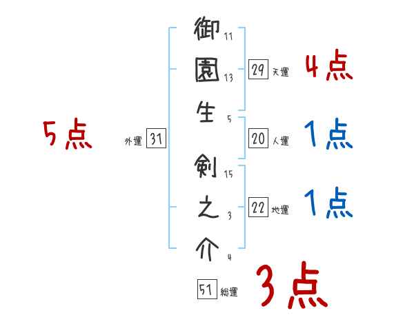 総運![]() | 御園生剣之介さんの総運は51画の3つ星!変化が激しく、危険に注意。堅実な性格。 あなたの人生を表す1番重要な運勢です。生涯を通じて影響する総合運となり、主に50歳以降の晩年期に影響を及ぼします。 |