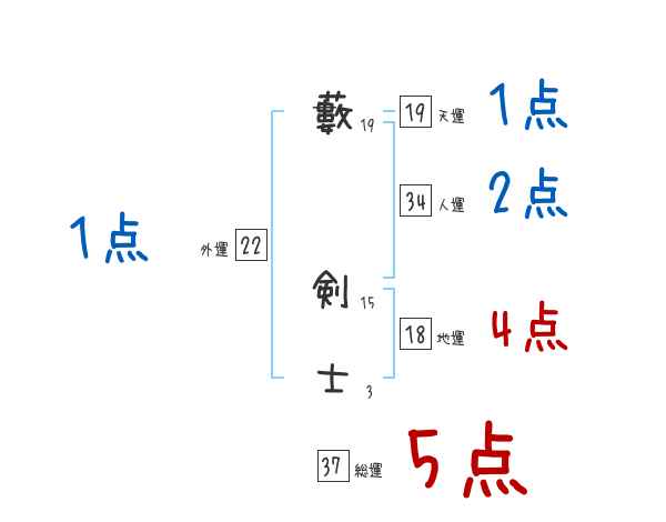 天運![]() | 藪剣士さんの天運は19画の1つ星!優れた才能を持ちますが、協調性が足りないことも。周りの人と協力する事を意識しましょう。 家系が持つ宿命的な運勢を表します。祖先から受け継いだ苗字ですので自分の力が及びません。家柄を象徴します。 |