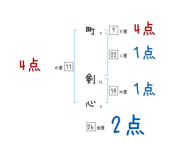 天運![]() | 町剣心さんの天運は7画の4つ星!強い意志や信念を持ち独立心が強い。自立する。 家系が持つ宿命的な運勢を表します。祖先から受け継いだ苗字ですので自分の力が及びません。家柄を象徴します。 |