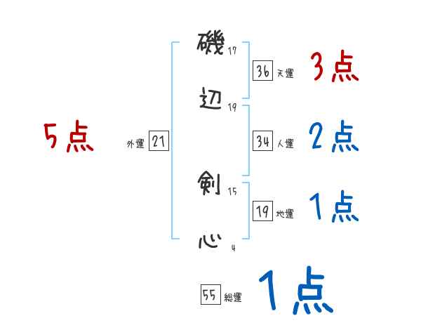 天運![]() | 磯辺剣心さんの天運は36画の3つ星!先見性が豊かです。多少神経質で苦労することも。 家系が持つ宿命的な運勢を表します。祖先から受け継いだ苗字ですので自分の力が及びません。家柄を象徴します。 |
