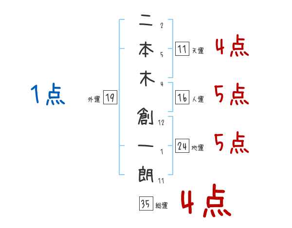 人運![]() | 二本木創一朗さんの人運は16画の5つ星!人望が厚く大きく発展する。逆転成功が見える。 性格や才能などを表す2番目に重要な運勢です。人間関係や協調性、社会的な成功に影響します。主に20歳から50歳ぐらいまでの中年期の運勢を表します。 |