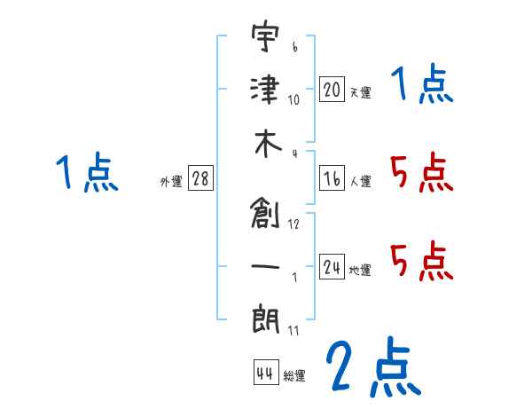 総運![]() | 宇津木創一朗さんの総運は44画の2つ星!誠実で慎重な性格。物事を考えすぎないように注意しましょう。 あなたの人生を表す1番重要な運勢です。生涯を通じて影響する総合運となり、主に50歳以降の晩年期に影響を及ぼします。 |