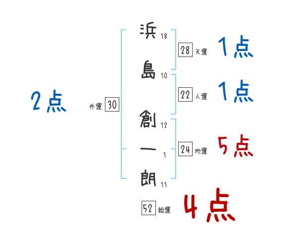 天運![]() | 浜島創一朗さんの天運は28画の1つ星!家庭環境に注意。スポーツで活躍できる能力があるかも。 家系が持つ宿命的な運勢を表します。祖先から受け継いだ苗字ですので自分の力が及びません。家柄を象徴します。 |