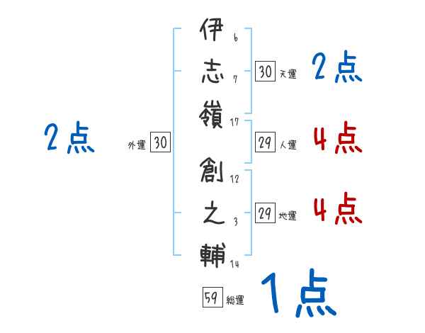 地運![]() | 伊志嶺創之輔さんの地運は29画の4つ星!完全主義で才能がある。厳格な心の持ち主。 個性を表す基礎的な運勢です。性格形成や対人関係、行動力など家庭環境に影響されます。主に誕生してから20歳くらいまでの若年期の運勢を表します。 |