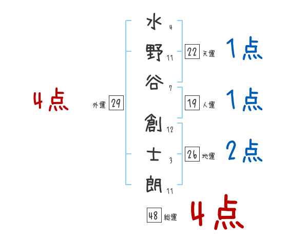 外運![]() | 水野谷創士朗さんの外運は29画の4つ星!完全主義で才能がある。厳格な心の持ち主。 生活面を象徴する運勢です。外部から受ける影響力を表し、結婚運、家庭運や職場、環境への順応性を表します。 |