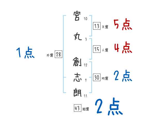 外運![]() | 宮丸創志朗さんの外運は28画の1つ星!家庭環境に注意。スポーツで活躍できる能力があるかも。 生活面を象徴する運勢です。外部から受ける影響力を表し、結婚運、家庭運や職場、環境への順応性を表します。 |