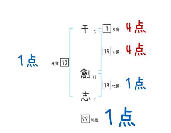 総運![]() | 千創志さんの総運は22画の1つ星!努力することが苦手ないっぽう手先が器用。芸術性にも優れる。 あなたの人生を表す1番重要な運勢です。生涯を通じて影響する総合運となり、主に50歳以降の晩年期に影響を及ぼします。 |