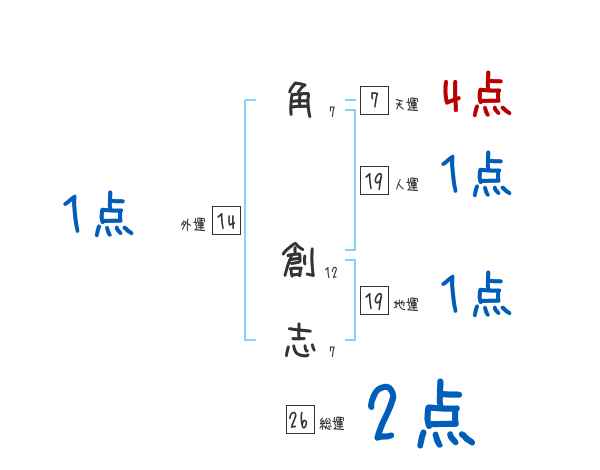 天運![]() | 角創志さんの天運は7画の4つ星!強い意志や信念を持ち独立心が強い。自立する。 家系が持つ宿命的な運勢を表します。祖先から受け継いだ苗字ですので自分の力が及びません。家柄を象徴します。 |