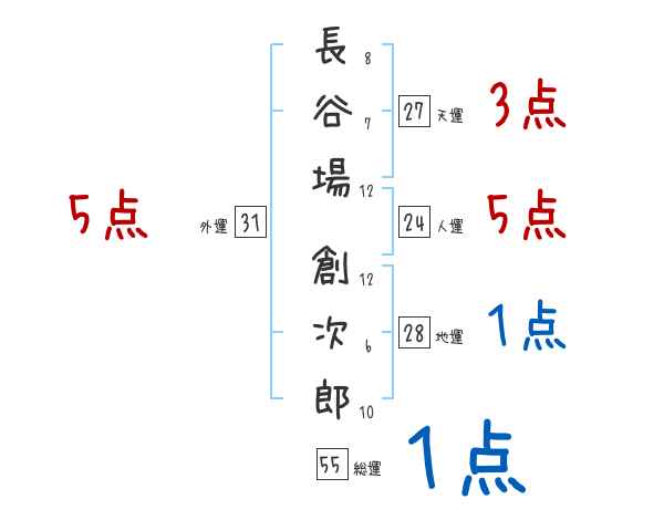 地運![]() | 長谷場創次郎さんの地運は28画の1つ星!家庭環境に注意。スポーツで活躍できる能力があるかも。 個性を表す基礎的な運勢です。性格形成や対人関係、行動力など家庭環境に影響されます。主に誕生してから20歳くらいまでの若年期の運勢を表します。 |