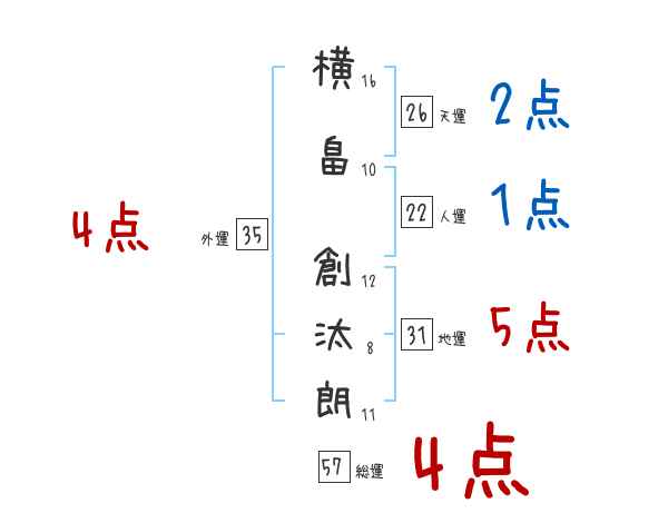 総運![]() | 横畠創汰朗さんの総運は57画の4つ星!向上心があり人望がある。地位を得る。 あなたの人生を表す1番重要な運勢です。生涯を通じて影響する総合運となり、主に50歳以降の晩年期に影響を及ぼします。 |
