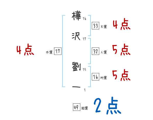 人運![]() | 樺沢劉一さんの人運は32画の5つ星!柔軟性があり成功する。チャンスが多く金運が良い。 性格や才能などを表す2番目に重要な運勢です。人間関係や協調性、社会的な成功に影響します。主に20歳から50歳ぐらいまでの中年期の運勢を表します。 |