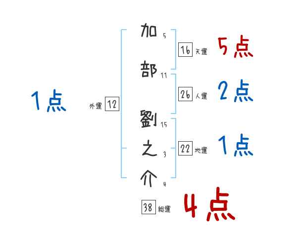 天運![]() | 加部劉之介さんの天運は16画の5つ星!人望が厚く大きく発展する。逆転成功が見える。 家系が持つ宿命的な運勢を表します。祖先から受け継いだ苗字ですので自分の力が及びません。家柄を象徴します。 |