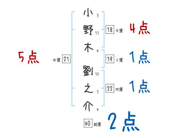 天運![]() | 小野木劉之介さんの天運は18画の4つ星!情熱的で剛気。忍耐力があり信頼される。 家系が持つ宿命的な運勢を表します。祖先から受け継いだ苗字ですので自分の力が及びません。家柄を象徴します。 |