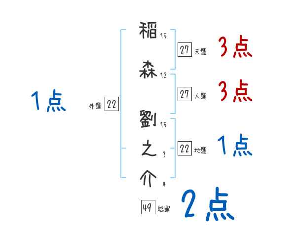 総運![]() | 稲森劉之介さんの総運は49画の2つ星!不安定な性格で明暗がある人生。周りの人には支援されやすい。 あなたの人生を表す1番重要な運勢です。生涯を通じて影響する総合運となり、主に50歳以降の晩年期に影響を及ぼします。 |